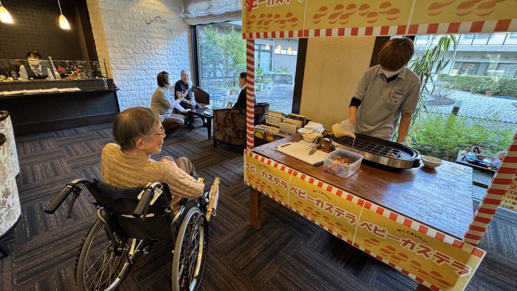 6日には、1階ラウンジにて祭りにちなんで”ベビーカステラ屋台”を開店。